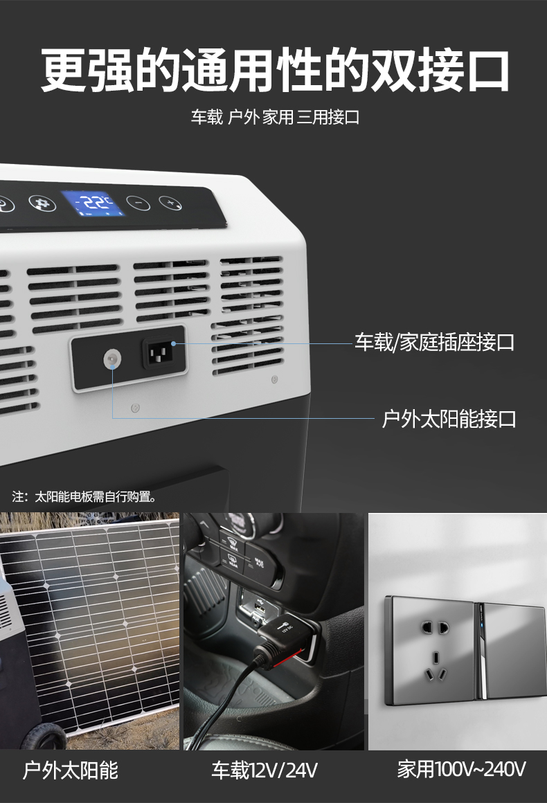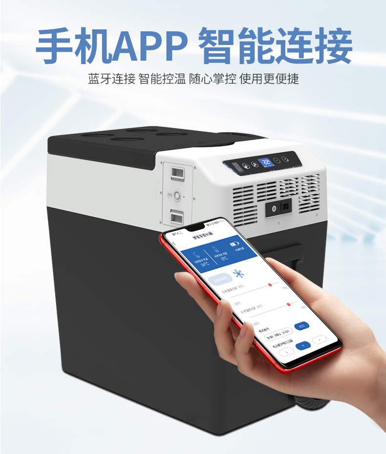 【智能控温】车载冰箱温度可通过蓝牙或数字屏上的按键控制。你可以通过手机上的蓝牙监控冰箱的温度。【电池保护】适用于交流和直流供电,配有3级电池显示器,保护电池。【低功耗】具有优良的低压保护功能,降低能耗。