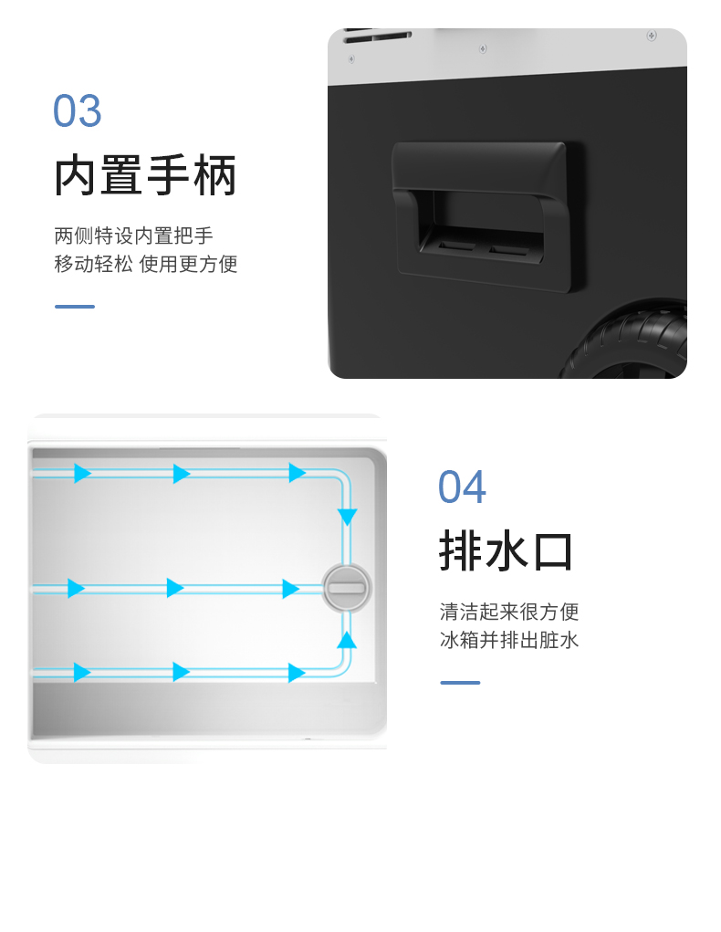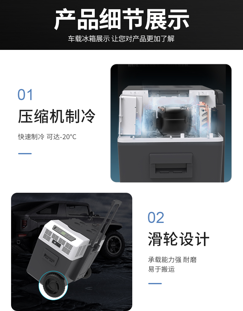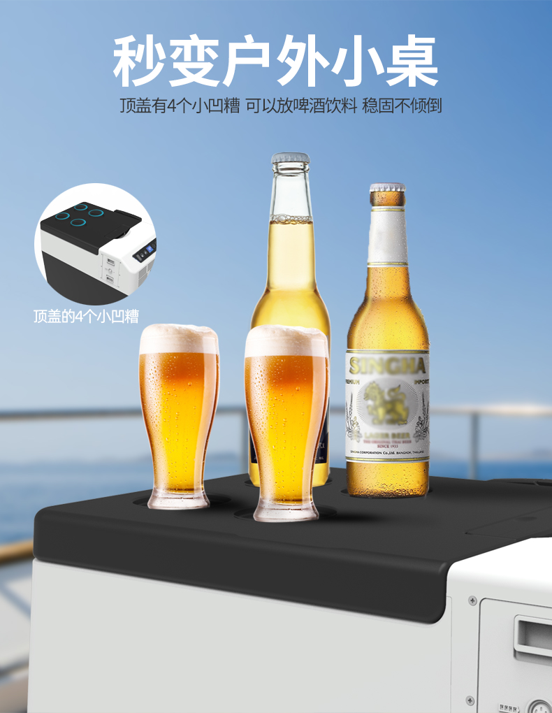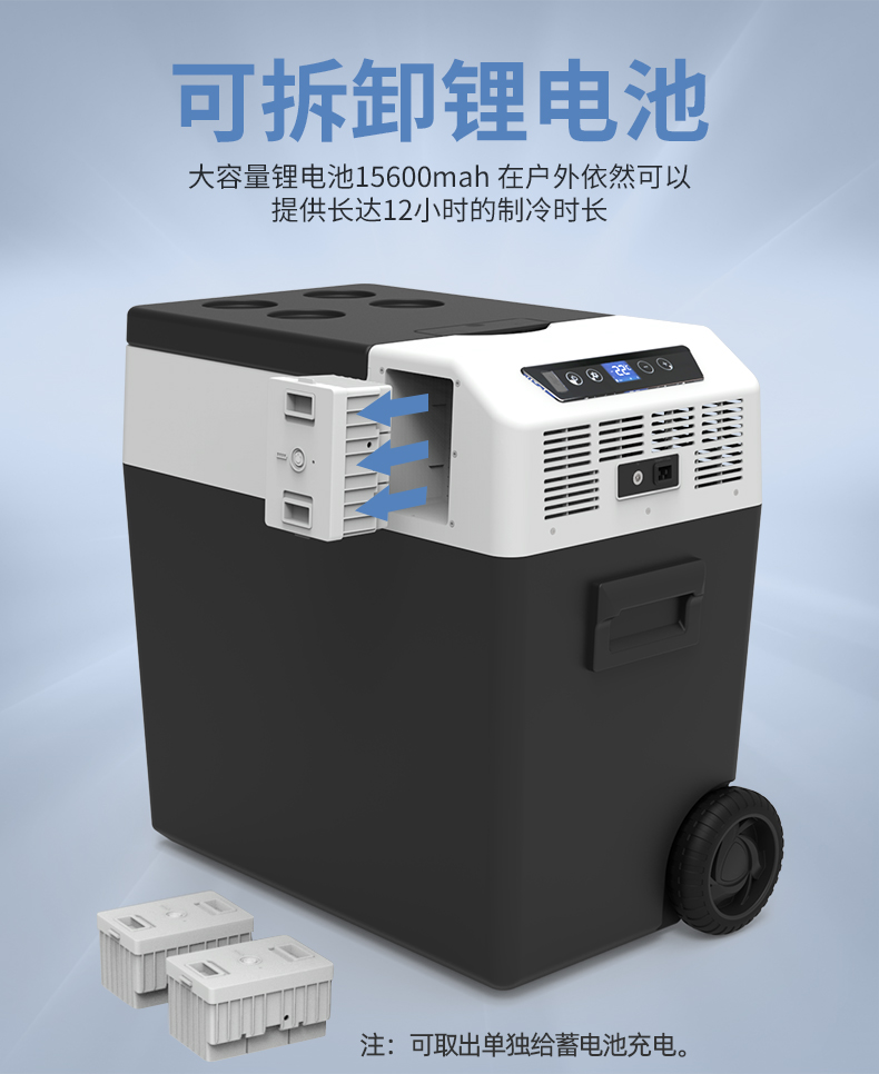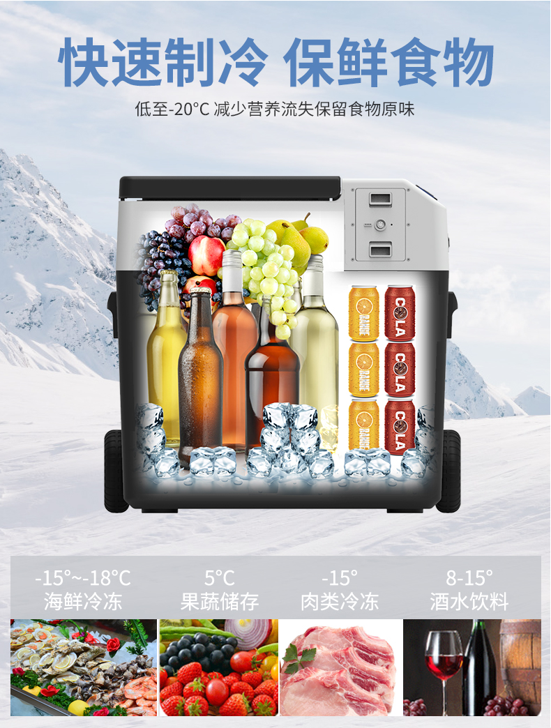 【设计】冰箱采用顶开设计,减少空调损耗,有利于节能。【内置电池】冰箱内置锂电池,断电后可随时为冰箱供电。【高品质压缩机】采用压缩机冷却技术,快速冷却至-22℃~+10℃,运行安静。